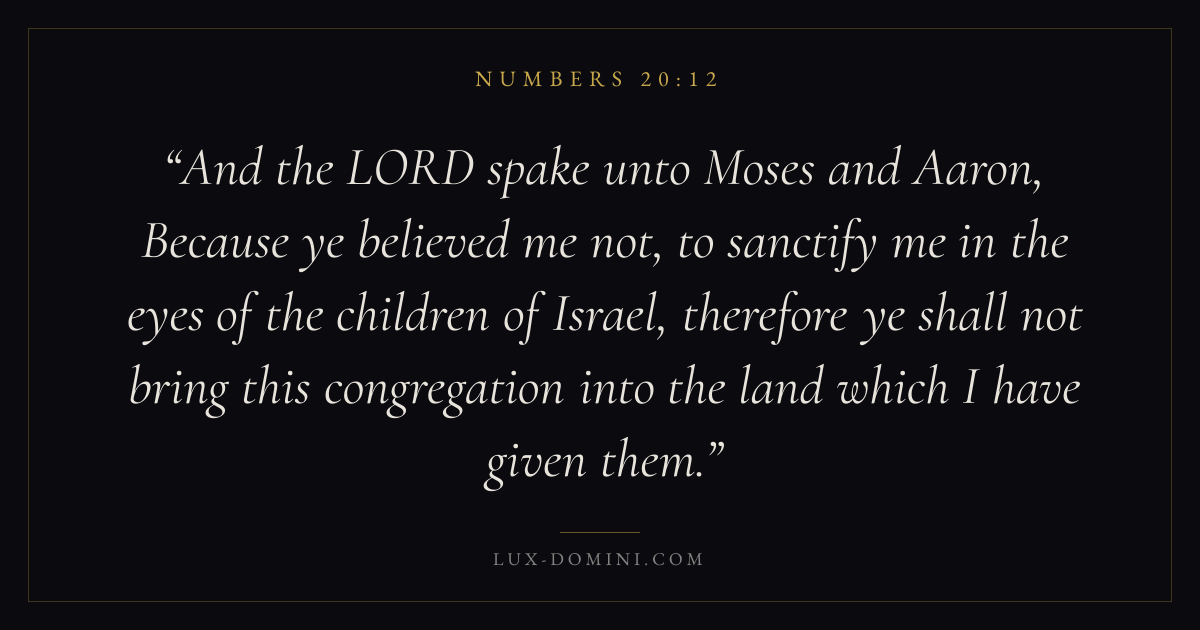 And the LORD spake unto Moses and Aaron, Because ye believed me not, to sanctify me in the eyes of the children of Israel, therefore ye shall not bring this congregation into the land which I have given them.