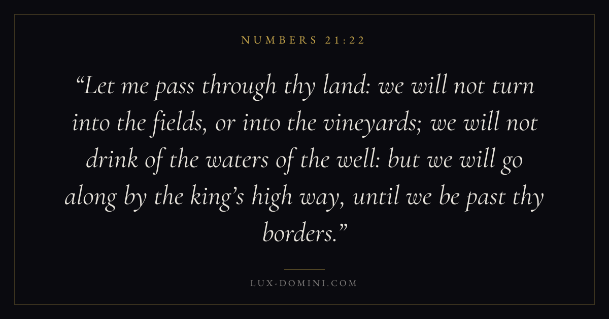 Let me pass through thy land: we will not turn into the fields, or into the vineyards; we will not drink of the waters of the well: but we will go along by the king’s high way, until we be past thy borders.