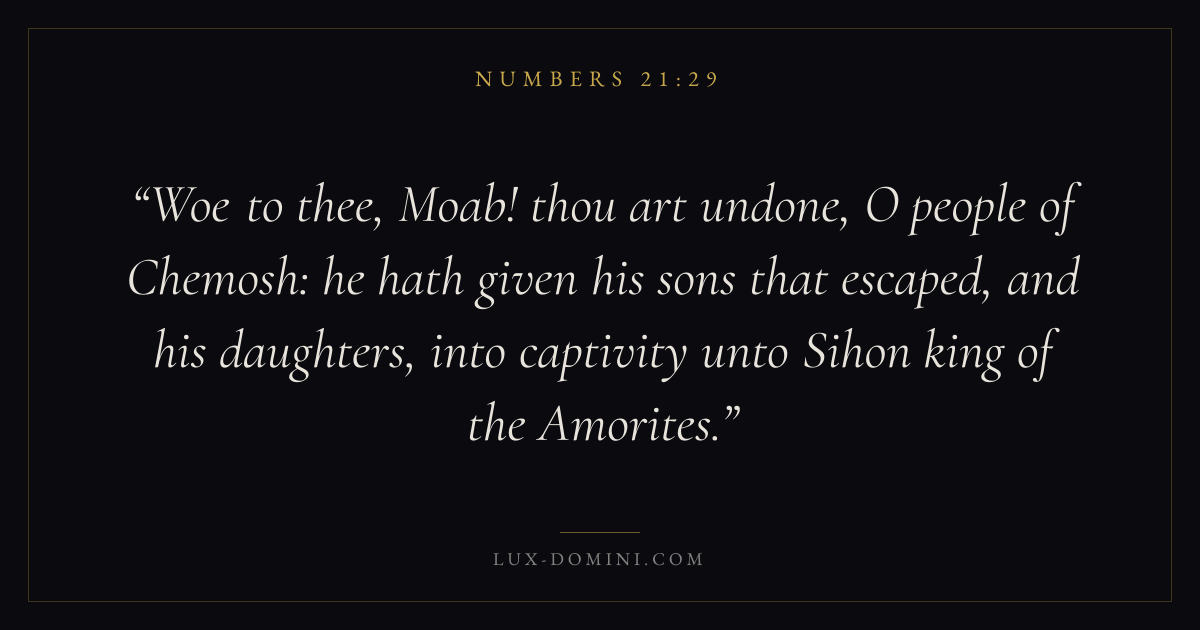 Woe to thee, Moab! thou art undone, O people of Chemosh: he hath given his sons that escaped, and his daughters, into captivity unto Sihon king of the Amorites.