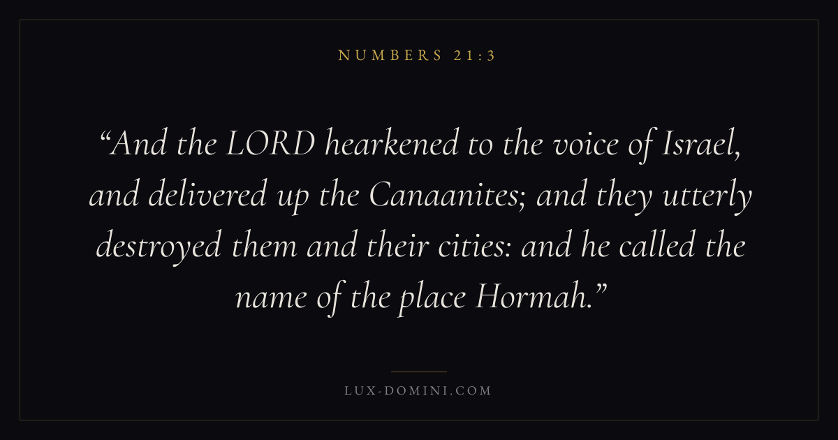 And the LORD hearkened to the voice of Israel, and delivered up the Canaanites; and they utterly destroyed them and their cities: and he called the name of the place Hormah.