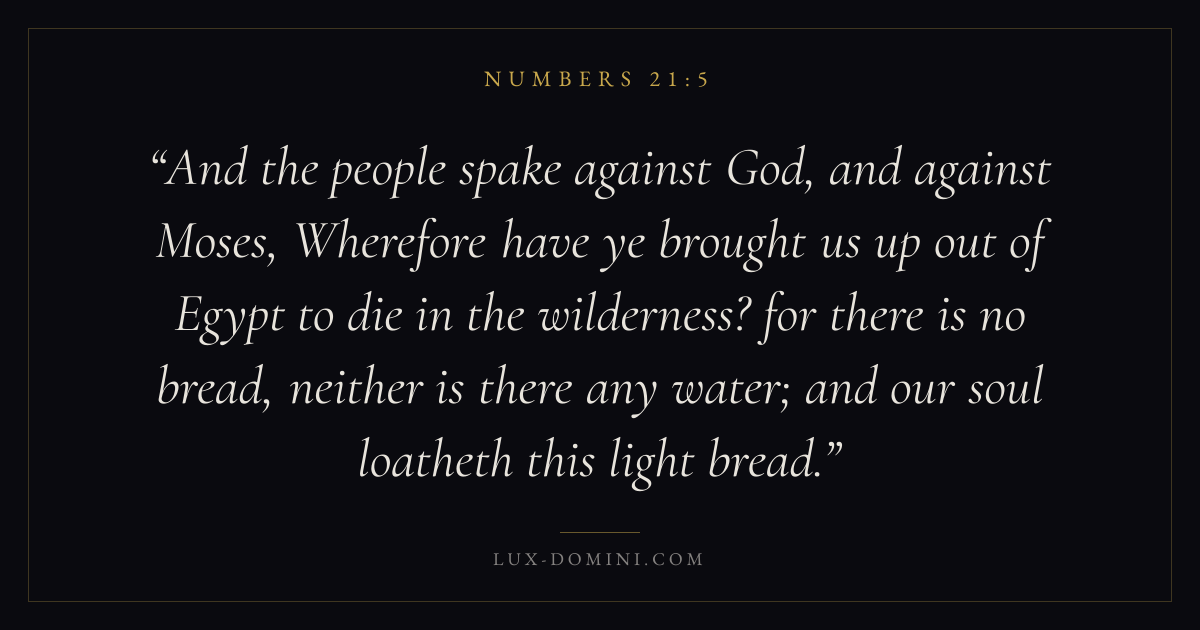 And the people spake against God, and against Moses, Wherefore have ye brought us up out of Egypt to die in the wilderness? for there is no bread, neither is there any water; and our soul loatheth this light bread.