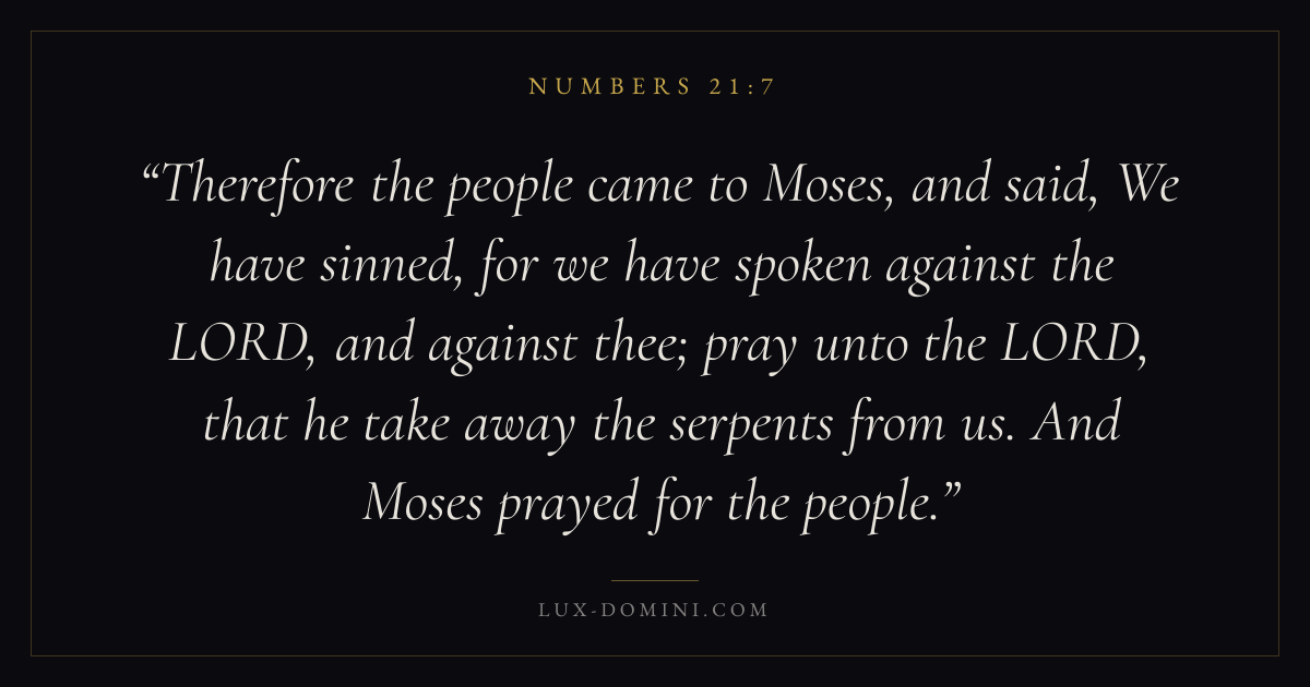 Therefore the people came to Moses, and said, We have sinned, for we have spoken against the LORD, and against thee; pray unto the LORD, that he take away the serpents from us. And Moses prayed for the people.