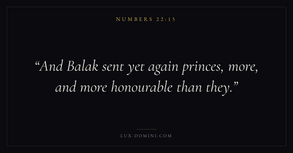Books / Numbers / Chapter 22 / Verse 15 ← Numbers 22:14 Numbers 22:15 Numbers 22:16 → And Balak sent yet again princes, more, and more honourable than they. Download verse card Share on Twitter Share on Facebook Pin it ✦ Key themes Justice and mercyPilgrimageRebellionJudgment Read with Numbers 22:16Numbers 22:17Micah 6:8Amos 5:24 Related topics Bible verses about justice and mercy Glossary Balak Person Empty; spoiler, a son of Zippor, and king of the Moabites ( Num. 22:2 , 4). From fear of the Israelites, who were encamped near the confines of his territory, he applied to Balaam (q. v. ) to curse them; but in vain. ✦ Numbers Chapter 22 verses V. 1 V. 2 V. 3 V. 4 V. 5 V. 6 V. 7 V. 8 V. 9 V. 10 V. 11 V. 12 V. 13 V. 14 V. 15 V. 16 V. 17 V. 18 V. 19 V. 20 V. 21 V. 22 V. 23 V. 24 V. 25 V. 26 V. 27 V. 28 V. 29 V. 30 V. 31 V. 32 V. 33 V. 34 V. 35 V. 36 V. 37 V. 38 V. 39 V. 40 V. 41