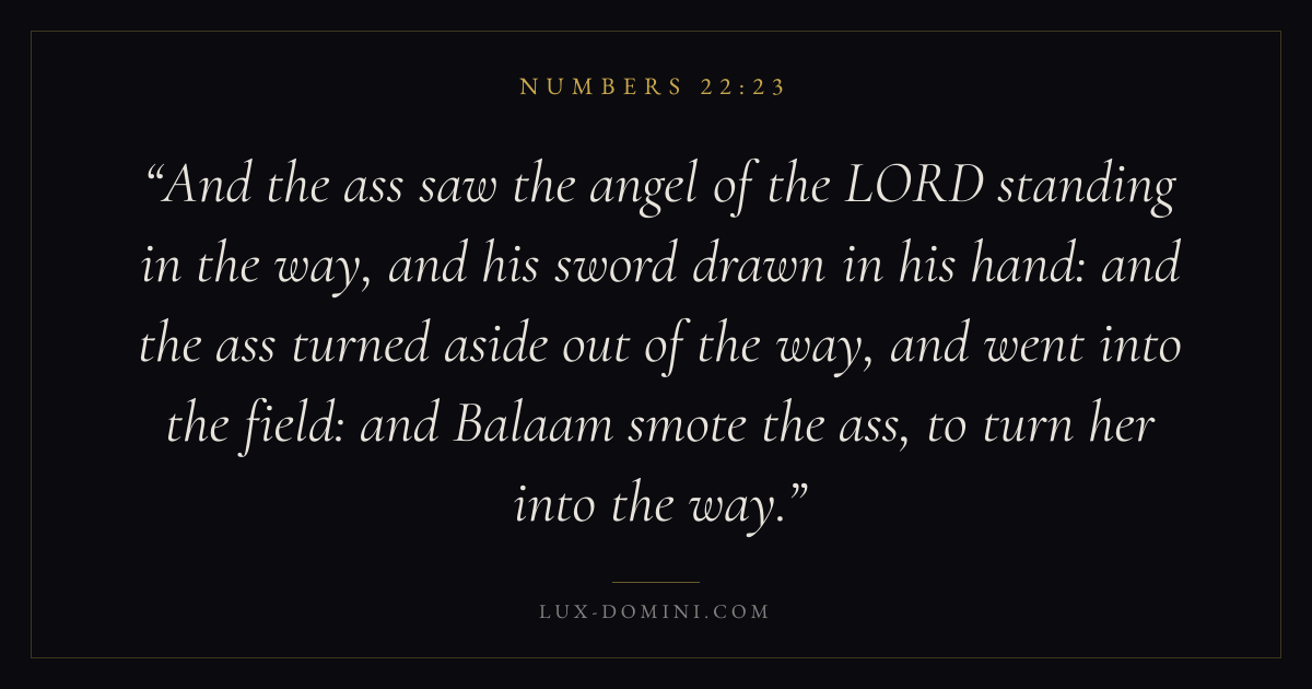 And the ass saw the angel of the LORD standing in the way, and his sword drawn in his hand: and the ass turned aside out of the way, and went into the field: and Balaam smote the ass, to turn her into the way.