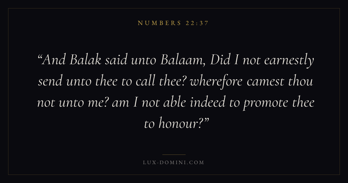 And Balak said unto Balaam, Did I not earnestly send unto thee to call thee? wherefore camest thou not unto me? am I not able indeed to promote thee to honour?