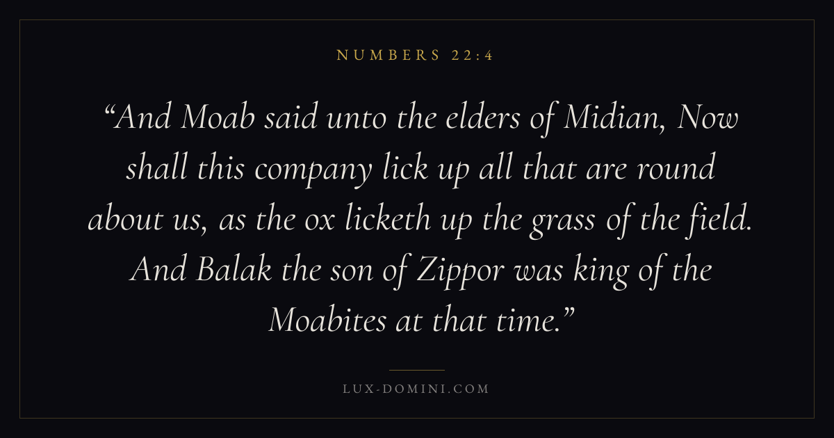 And Moab said unto the elders of Midian, Now shall this company lick up all that are round about us, as the ox licketh up the grass of the field. And Balak the son of Zippor was king of the Moabites at that time.