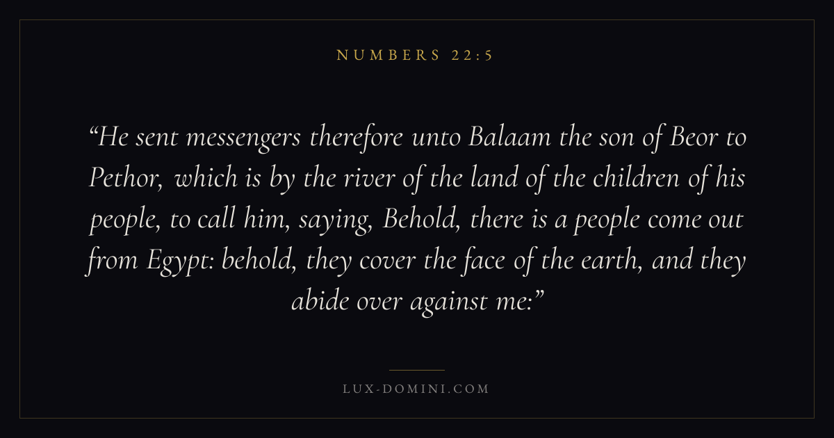 He sent messengers therefore unto Balaam the son of Beor to Pethor, which is by the river of the land of the children of his people, to call him, saying, Behold, there is a people come out from Egypt: behold, they cover the face of the earth, and they abide over against me: