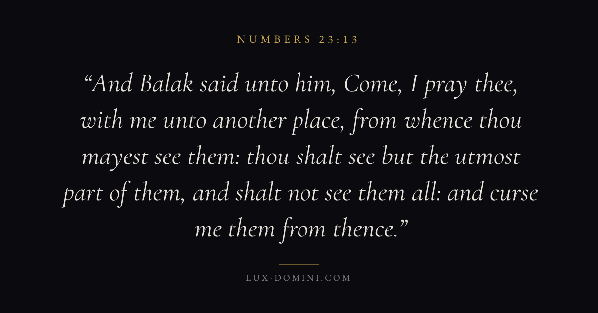 And Balak said unto him, Come, I pray thee, with me unto another place, from whence thou mayest see them: thou shalt see but the utmost part of them, and shalt not see them all: and curse me them from thence.