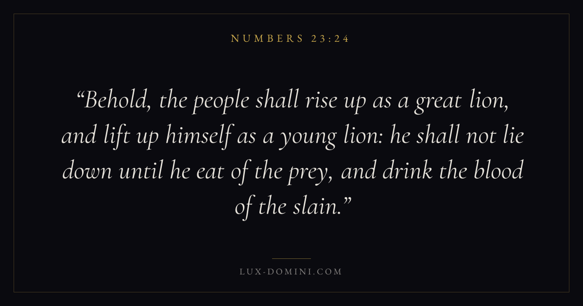 Behold, the people shall rise up as a great lion, and lift up himself as a young lion: he shall not lie down until he eat of the prey, and drink the blood of the slain.