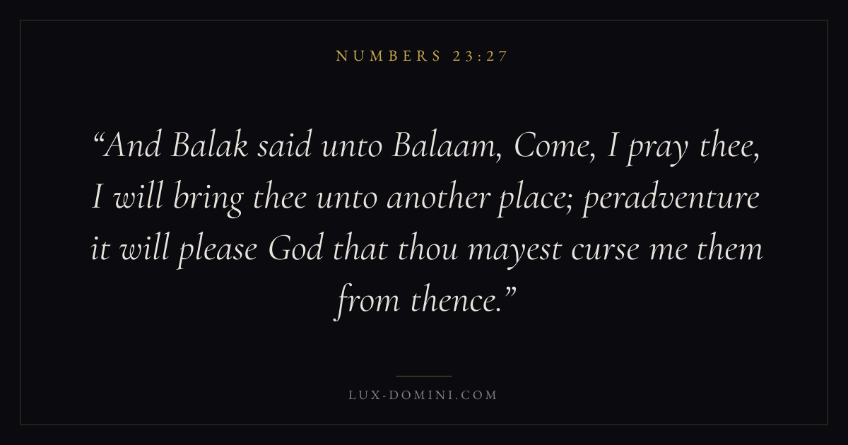 And Balak said unto Balaam, Come, I pray thee, I will bring thee unto another place; peradventure it will please God that thou mayest curse me them from thence.