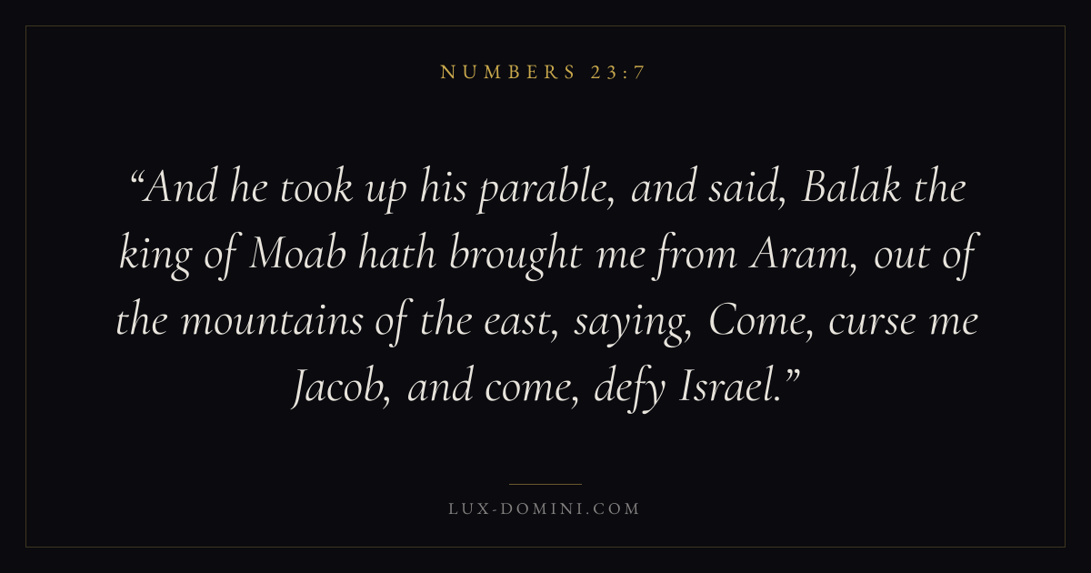 And he took up his parable, and said, Balak the king of Moab hath brought me from Aram, out of the mountains of the east, saying, Come, curse me Jacob, and come, defy Israel.
