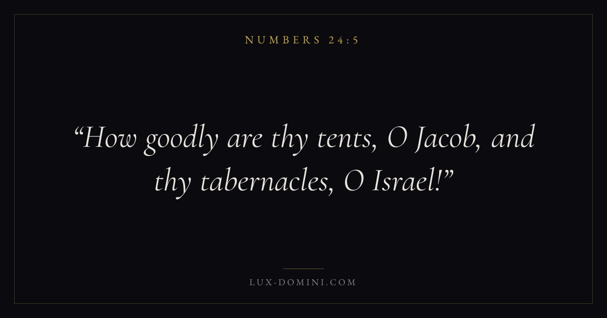 Books / Numbers / Chapter 24 / Verse 5 ← Numbers 24:4 Numbers 24:5 Numbers 24:6 → How goodly are thy tents, O Jacob, and thy tabernacles, O Israel! Download verse card Share on Twitter Share on Facebook Pin it ✦ Key themes Justice and mercyPilgrimageRebellionJudgment Read with Numbers 24:1Numbers 24:2Micah 6:8Amos 5:24 Related topics Bible verses about justice and mercy ✦ Numbers Chapter 24 verses V. 1 V. 2 V. 3 V. 4 V. 5 V. 6 V. 7 V. 8 V. 9 V. 10 V. 11 V. 12 V. 13 V. 14 V. 15 V. 16 V. 17 V. 18 V. 19 V. 20 V. 21 V. 22 V. 23 V. 24 V. 25