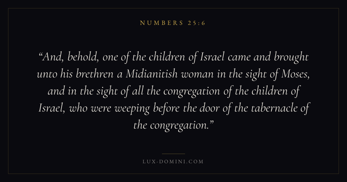 And, behold, one of the children of Israel came and brought unto his brethren a Midianitish woman in the sight of Moses, and in the sight of all the congregation of the children of Israel, who were weeping before the door of the tabernacle of the congregation.