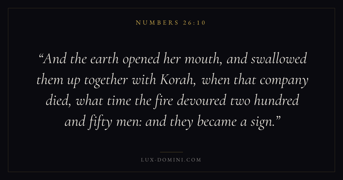 And the earth opened her mouth, and swallowed them up together with Korah, when that company died, what time the fire devoured two hundred and fifty men: and they became a sign.