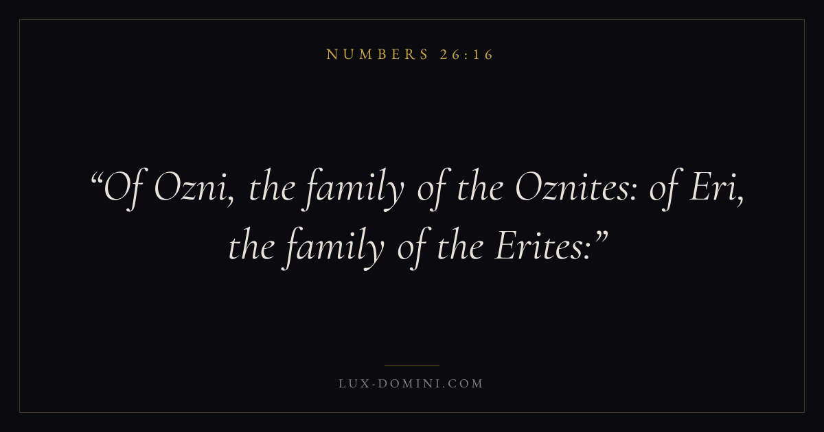 Books / Numbers / Chapter 26 / Verse 16 ← Numbers 26:15 Numbers 26:16 Numbers 26:17 → Of Ozni, the family of the Oznites: of Eri, the family of the Erites: Download verse card Share on Twitter Share on Facebook Pin it ✦ Key themes Justice and mercyPilgrimageRebellionJudgment Read with Numbers 26:15Numbers 26:17Micah 6:8Amos 5:24 Related topics Bible verses about justice and mercy ✦ Numbers Chapter 26 verses V. 1 V. 2 V. 3 V. 4 V. 5 V. 6 V. 7 V. 8 V. 9 V. 10 V. 11 V. 12 V. 13 V. 14 V. 15 V. 16 V. 17 V. 18 V. 19 V. 20 V. 21 V. 22 V. 23 V. 24 V. 25 V. 26 V. 27 V. 28 V. 29 V. 30 V. 31 V. 32 V. 33 V. 34 V. 35 V. 36 V. 37 V. 38 V. 39 V. 40 V. 41 V. 42 V. 43 V. 44 V. 45 V. 46 V. 47 V. 48 V. 49 V. 50 V. 51 V. 52 V. 53 V. 54 V. 55 V. 56 V. 57 V. 58 V. 59 V. 60 V. 61 V. 62 V. 63 V. 64 V. 65