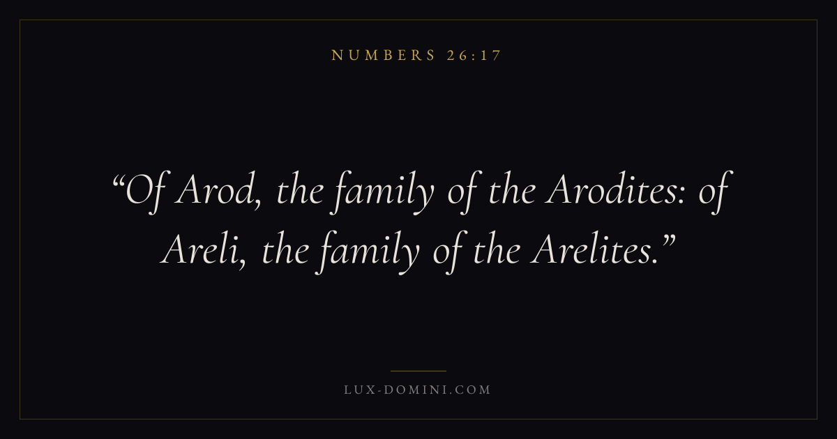 Books / Numbers / Chapter 26 / Verse 17 ← Numbers 26:16 Numbers 26:17 Numbers 26:18 → Of Arod, the family of the Arodites: of Areli, the family of the Arelites. Download verse card Share on Twitter Share on Facebook Pin it ✦ Key themes Justice and mercyPilgrimageRebellionJudgment Read with Numbers 26:15Numbers 26:16Micah 6:8Amos 5:24 Related topics Bible verses about justice and mercy ✦ Numbers Chapter 26 verses V. 1 V. 2 V. 3 V. 4 V. 5 V. 6 V. 7 V. 8 V. 9 V. 10 V. 11 V. 12 V. 13 V. 14 V. 15 V. 16 V. 17 V. 18 V. 19 V. 20 V. 21 V. 22 V. 23 V. 24 V. 25 V. 26 V. 27 V. 28 V. 29 V. 30 V. 31 V. 32 V. 33 V. 34 V. 35 V. 36 V. 37 V. 38 V. 39 V. 40 V. 41 V. 42 V. 43 V. 44 V. 45 V. 46 V. 47 V. 48 V. 49 V. 50 V. 51 V. 52 V. 53 V. 54 V. 55 V. 56 V. 57 V. 58 V. 59 V. 60 V. 61 V. 62 V. 63 V. 64 V. 65