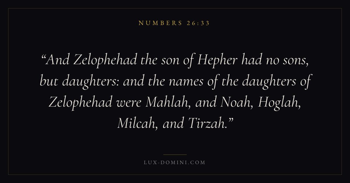 And Zelophehad the son of Hepher had no sons, but daughters: and the names of the daughters of Zelophehad were Mahlah, and Noah, Hoglah, Milcah, and Tirzah.