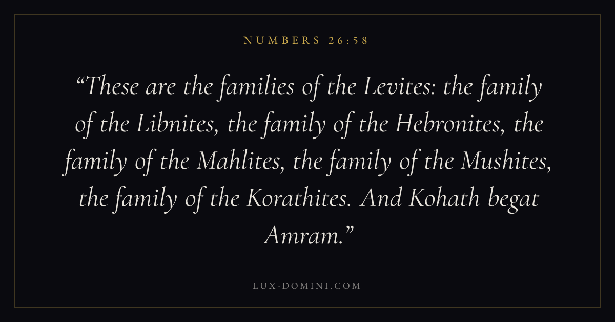 These are the families of the Levites: the family of the Libnites, the family of the Hebronites, the family of the Mahlites, the family of the Mushites, the family of the Korathites. And Kohath begat Amram.