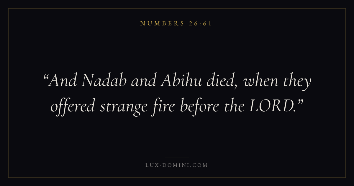 Books / Numbers / Chapter 26 / Verse 61 ← Numbers 26:60 Numbers 26:61 Numbers 26:62 → And Nadab and Abihu died, when they offered strange fire before the LORD. Download verse card Share on Twitter Share on Facebook Pin it ✦ Key themes Justice and mercyPeacePilgrimageRebellion Read with Numbers 26:58Numbers 26:59Micah 6:8Amos 5:24 Related topics Bible verses about justice and mercyBible verses about peace Glossary Abihu Person Father of Him; i. e., “worshipper of God”, the second of the sons of Aaron ( Ex. 6:23 ; Num. 3:2 ; 26:60 ; 1 Chr. 6:3 ). Along with his three brothers he was consecrated to the priest’s office ( Ex. 28:1 ). ✦ Numbers Chapter 26 verses V. 1 V. 2 V. 3 V. 4 V. 5 V. 6 V. 7 V. 8 V. 9 V. 10 V. 11 V. 12 V. 13 V. 14 V. 15 V. 16 V. 17 V. 18 V. 19 V. 20 V. 21 V. 22 V. 23 V. 24 V. 25 V. 26 V. 27 V. 28 V. 29 V. 30 V. 31 V. 32 V. 33 V. 34 V. 35 V. 36 V. 37 V. 38 V. 39 V. 40 V. 41 V. 42 V. 43 V. 44 V. 45 V. 46 V. 47 V. 48 V. 49 V. 50 V. 51 V. 52 V. 53 V. 54 V. 55 V. 56 V. 57 V. 58 V. 59 V. 60 V. 61 V. 62 V. 63 V. 64 V. 65