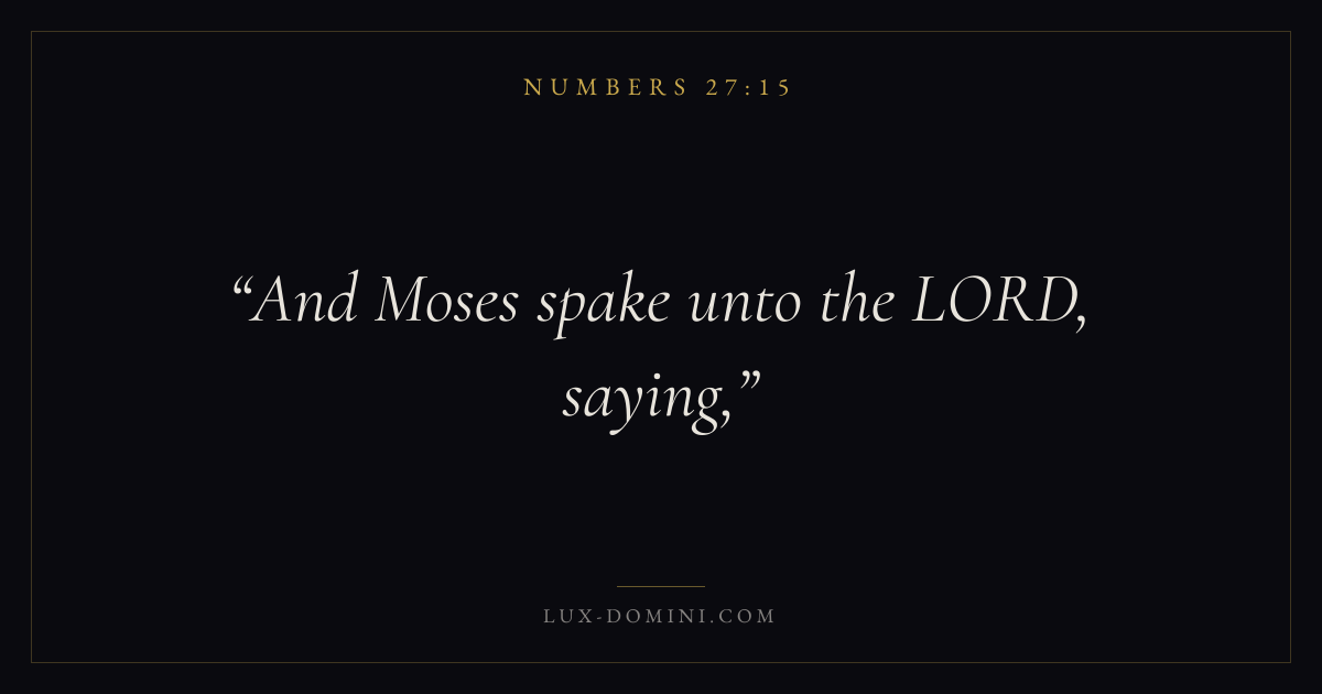 Books / Numbers / Chapter 27 / Verse 15 ← Numbers 27:14 Numbers 27:15 Numbers 27:16 → And Moses spake unto the LORD, saying, Download verse card Share on Twitter Share on Facebook Pin it ✦ Key themes LoveJustice and mercyPilgrimageRebellion Read with Numbers 27:16Numbers 27:17John 3:161 Corinthians 13:4 Related topics Bible verses about loveBible verses about justice and mercy ✦ Numbers Chapter 27 verses V. 1 V. 2 V. 3 V. 4 V. 5 V. 6 V. 7 V. 8 V. 9 V. 10 V. 11 V. 12 V. 13 V. 14 V. 15 V. 16 V. 17 V. 18 V. 19 V. 20 V. 21 V. 22 V. 23
