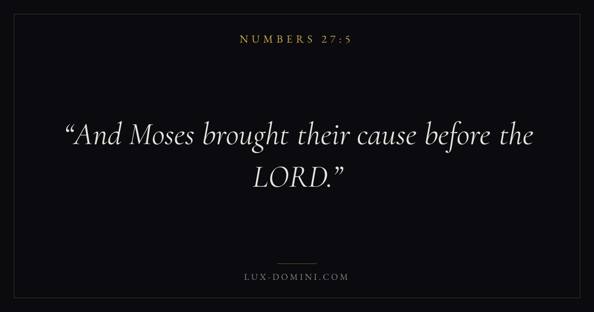 Books / Numbers / Chapter 27 / Verse 5 ← Numbers 27:4 Numbers 27:5 Numbers 27:6 → And Moses brought their cause before the LORD. Download verse card Share on Twitter Share on Facebook Pin it ✦ Key themes Justice and mercyPilgrimageRebellionJudgment Read with Numbers 27:1Numbers 27:2Micah 6:8Amos 5:24 Related topics Bible verses about justice and mercy ✦ Numbers Chapter 27 verses V. 1 V. 2 V. 3 V. 4 V. 5 V. 6 V. 7 V. 8 V. 9 V. 10 V. 11 V. 12 V. 13 V. 14 V. 15 V. 16 V. 17 V. 18 V. 19 V. 20 V. 21 V. 22 V. 23