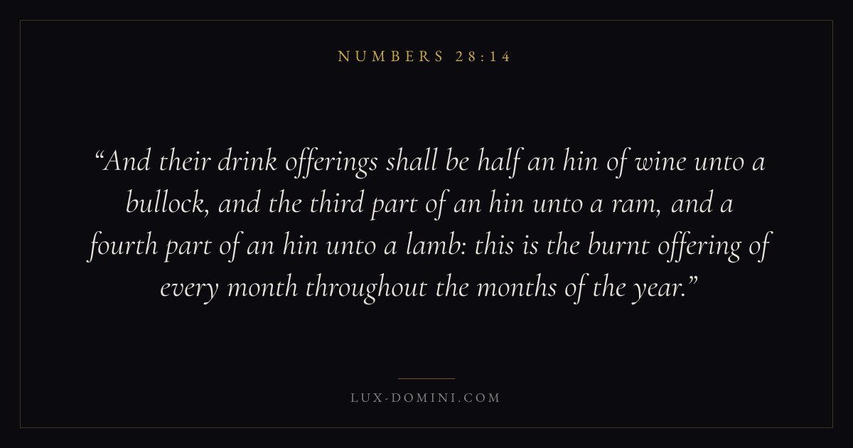 And their drink offerings shall be half an hin of wine unto a bullock, and the third part of an hin unto a ram, and a fourth part of an hin unto a lamb: this is the burnt offering of every month throughout the months of the year.