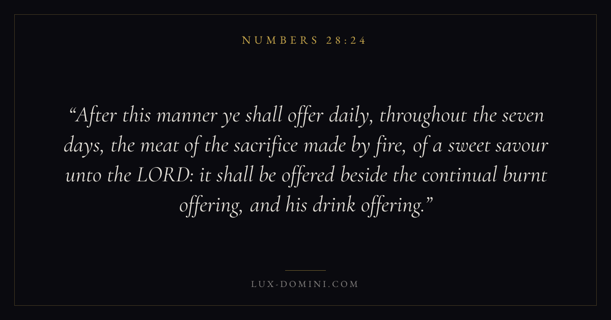After this manner ye shall offer daily, throughout the seven days, the meat of the sacrifice made by fire, of a sweet savour unto the LORD: it shall be offered beside the continual burnt offering, and his drink offering.