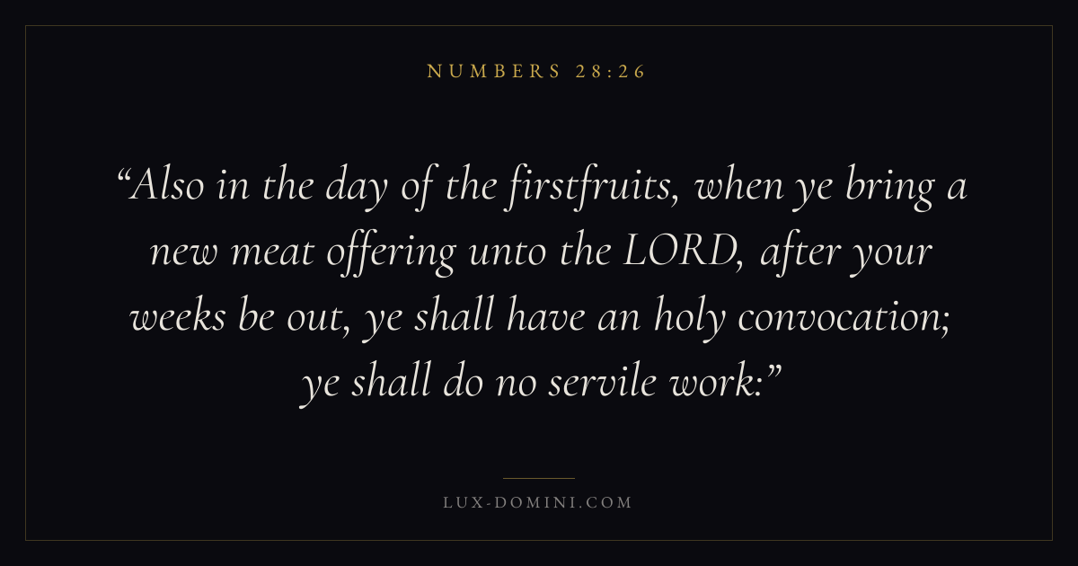 Also in the day of the firstfruits, when ye bring a new meat offering unto the LORD, after your weeks be out, ye shall have an holy convocation; ye shall do no servile work: