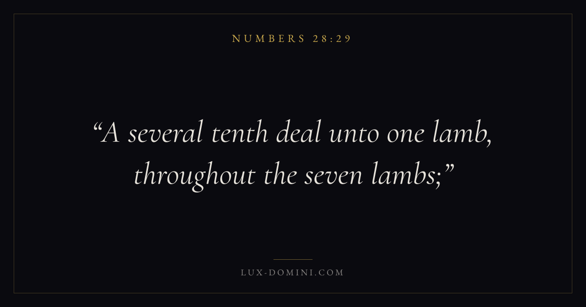 Books / Numbers / Chapter 28 / Verse 29 ← Numbers 28:28 Numbers 28:29 Numbers 28:30 → A several tenth deal unto one lamb, throughout the seven lambs; Download verse card Share on Twitter Share on Facebook Pin it ✦ Key themes Justice and mercyPilgrimageRebellionJudgment Read with Numbers 28:26Numbers 28:27Micah 6:8Amos 5:24 Related topics Bible verses about justice and mercy ✦ Numbers Chapter 28 verses V. 1 V. 2 V. 3 V. 4 V. 5 V. 6 V. 7 V. 8 V. 9 V. 10 V. 11 V. 12 V. 13 V. 14 V. 15 V. 16 V. 17 V. 18 V. 19 V. 20 V. 21 V. 22 V. 23 V. 24 V. 25 V. 26 V. 27 V. 28 V. 29 V. 30 V. 31