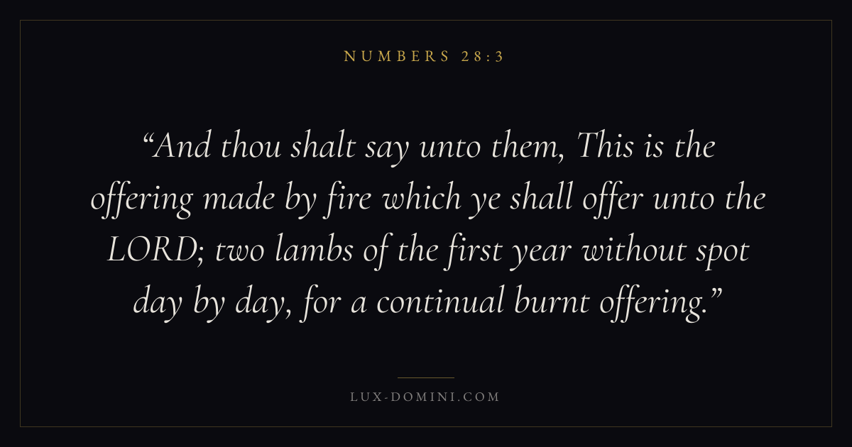And thou shalt say unto them, This is the offering made by fire which ye shall offer unto the LORD; two lambs of the first year without spot day by day, for a continual burnt offering.