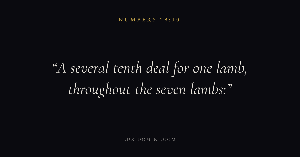 Books / Numbers / Chapter 29 / Verse 10 ← Numbers 29:9 Numbers 29:10 Numbers 29:11 → A several tenth deal for one lamb, throughout the seven lambs: Download verse card Share on Twitter Share on Facebook Pin it ✦ Key themes Justice and mercyPilgrimageRebellionJudgment Read with Numbers 29:7Numbers 29:8Micah 6:8Amos 5:24 Related topics Bible verses about justice and mercy ✦ Numbers Chapter 29 verses V. 1 V. 2 V. 3 V. 4 V. 5 V. 6 V. 7 V. 8 V. 9 V. 10 V. 11 V. 12 V. 13 V. 14 V. 15 V. 16 V. 17 V. 18 V. 19 V. 20 V. 21 V. 22 V. 23 V. 24 V. 25 V. 26 V. 27 V. 28 V. 29 V. 30 V. 31 V. 32 V. 33 V. 34 V. 35 V. 36 V. 37 V. 38 V. 39 V. 40