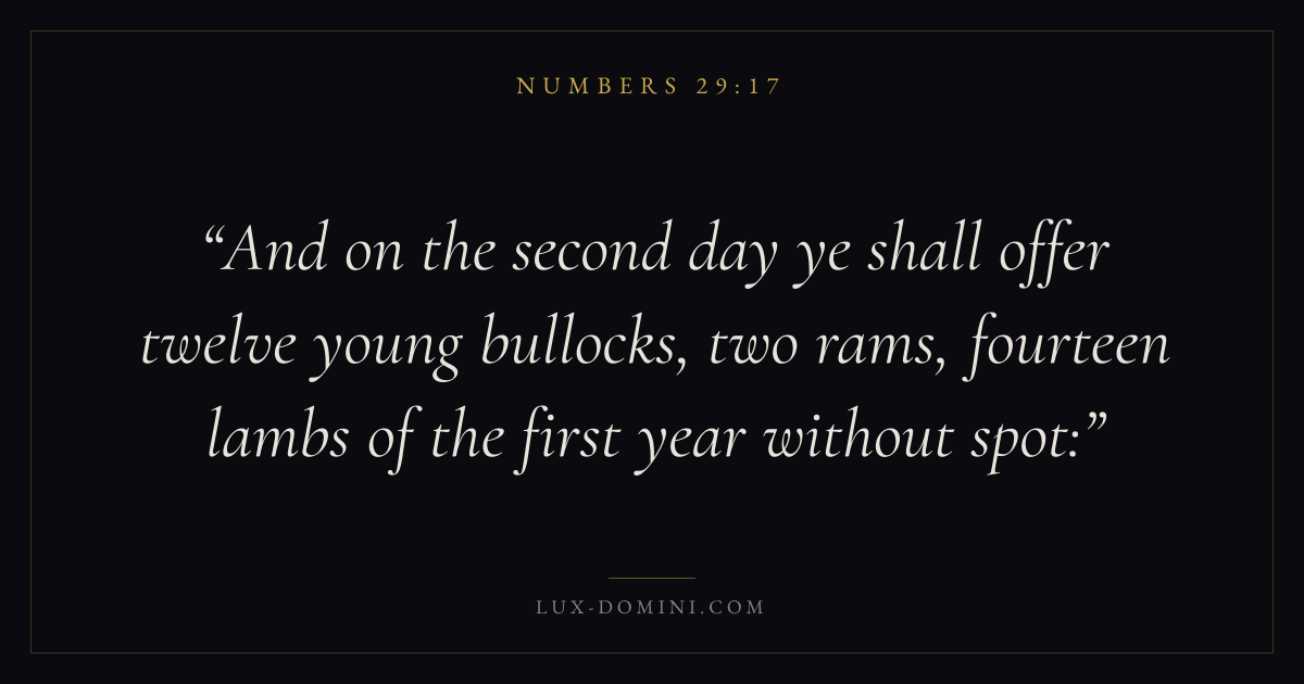 And on the second day ye shall offer twelve young bullocks, two rams, fourteen lambs of the first year without spot: