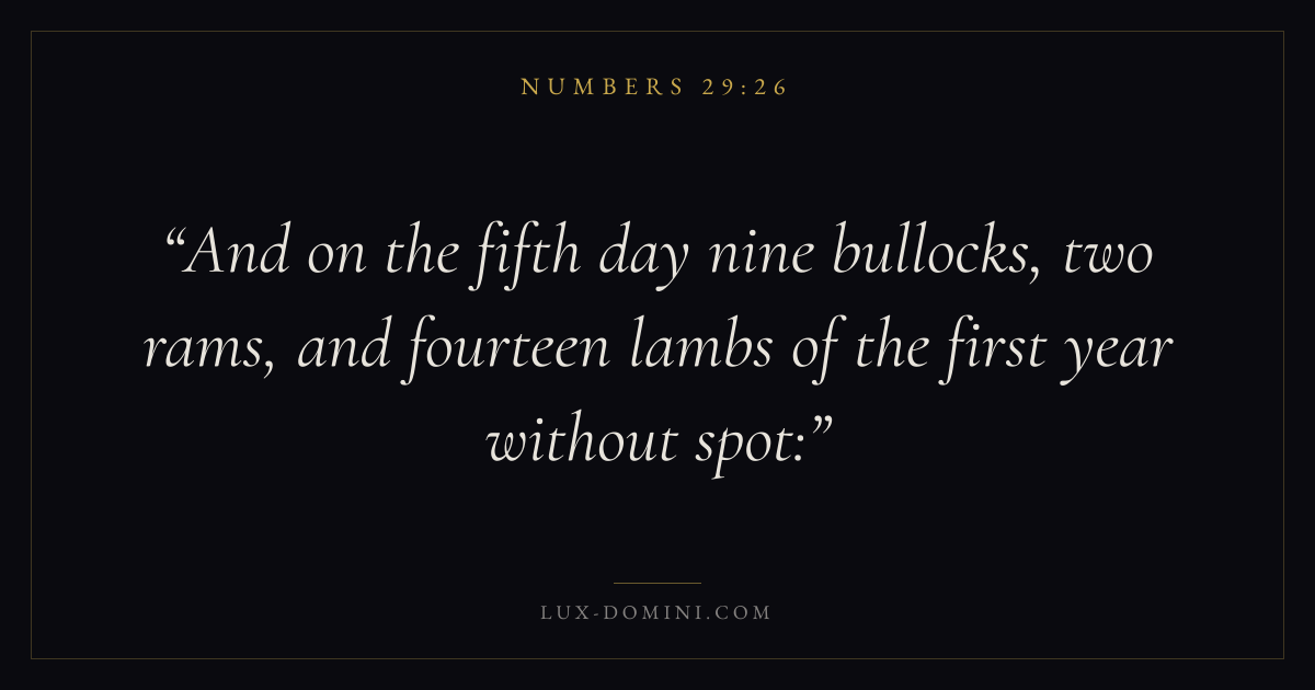 And on the fifth day nine bullocks, two rams, and fourteen lambs of the first year without spot: