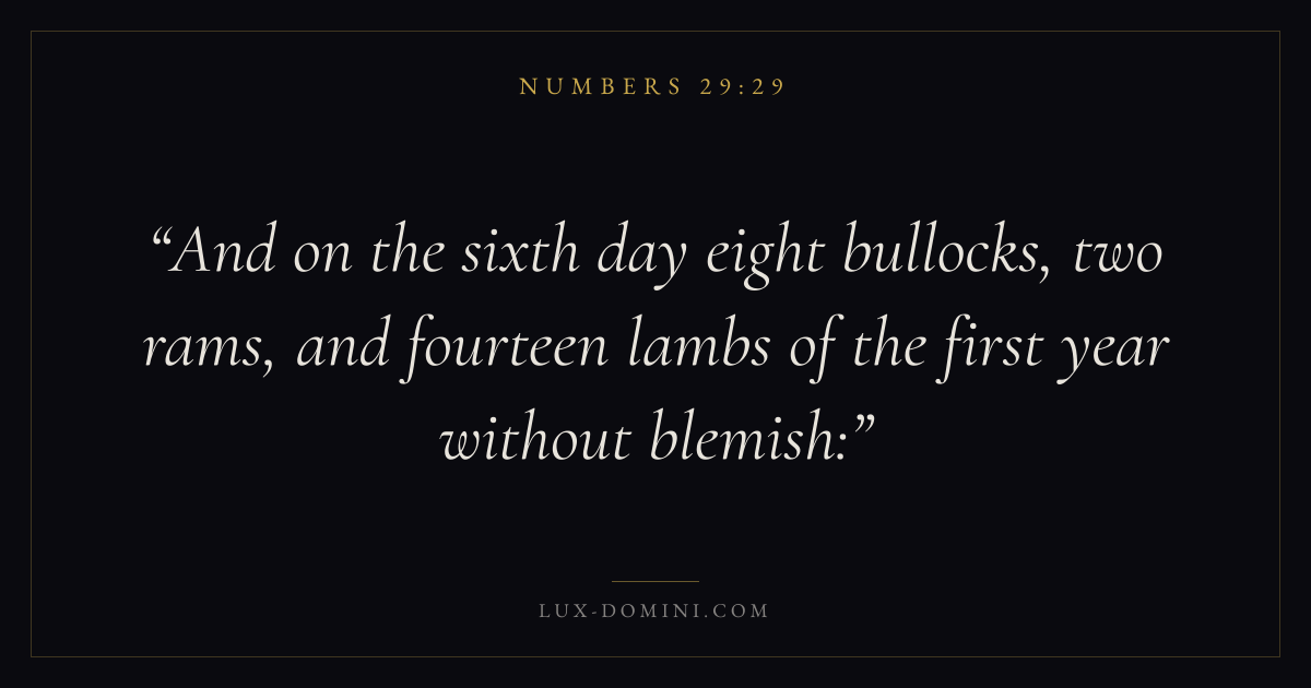And on the sixth day eight bullocks, two rams, and fourteen lambs of the first year without blemish: