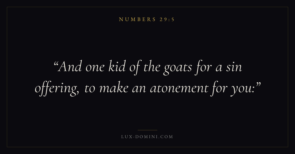 Books / Numbers / Chapter 29 / Verse 5 ← Numbers 29:4 Numbers 29:5 Numbers 29:6 → And one kid of the goats for a sin offering, to make an atonement for you: Download verse card Share on Twitter Share on Facebook Pin it ✦ Key themes Justice and mercyPilgrimageRebellionJudgment Read with Numbers 29:1Numbers 29:2Micah 6:8Amos 5:24 Related topics Bible verses about justice and mercy ✦ Numbers Chapter 29 verses V. 1 V. 2 V. 3 V. 4 V. 5 V. 6 V. 7 V. 8 V. 9 V. 10 V. 11 V. 12 V. 13 V. 14 V. 15 V. 16 V. 17 V. 18 V. 19 V. 20 V. 21 V. 22 V. 23 V. 24 V. 25 V. 26 V. 27 V. 28 V. 29 V. 30 V. 31 V. 32 V. 33 V. 34 V. 35 V. 36 V. 37 V. 38 V. 39 V. 40