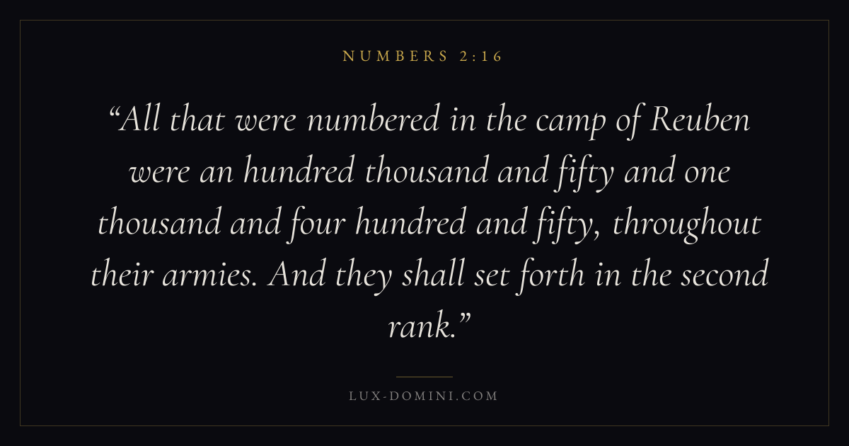 All that were numbered in the camp of Reuben were an hundred thousand and fifty and one thousand and four hundred and fifty, throughout their armies. And they shall set forth in the second rank.