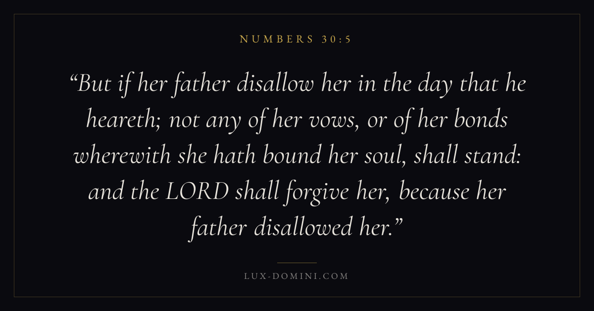 But if her father disallow her in the day that he heareth; not any of her vows, or of her bonds wherewith she hath bound her soul, shall stand: and the LORD shall forgive her, because her father disallowed her.
