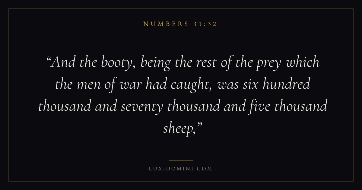 And the booty, being the rest of the prey which the men of war had caught, was six hundred thousand and seventy thousand and five thousand sheep,