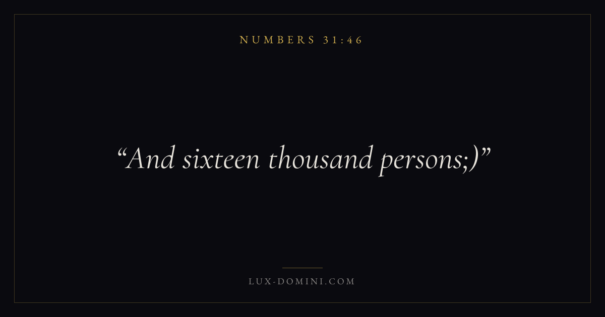 Books / Numbers / Chapter 31 / Verse 46 ← Numbers 31:45 Numbers 31:46 Numbers 31:47 → And sixteen thousand persons;) Download verse card Share on Twitter Share on Facebook Pin it ✦ Key themes Justice and mercyPilgrimageRebellionJudgment Read with Numbers 31:45Numbers 31:47Micah 6:8Amos 5:24 Related topics Bible verses about justice and mercy ✦ Numbers Chapter 31 verses V. 1 V. 2 V. 3 V. 4 V. 5 V. 6 V. 7 V. 8 V. 9 V. 10 V. 11 V. 12 V. 13 V. 14 V. 15 V. 16 V. 17 V. 18 V. 19 V. 20 V. 21 V. 22 V. 23 V. 24 V. 25 V. 26 V. 27 V. 28 V. 29 V. 30 V. 31 V. 32 V. 33 V. 34 V. 35 V. 36 V. 37 V. 38 V. 39 V. 40 V. 41 V. 42 V. 43 V. 44 V. 45 V. 46 V. 47 V. 48 V. 49 V. 50 V. 51 V. 52 V. 53 V. 54