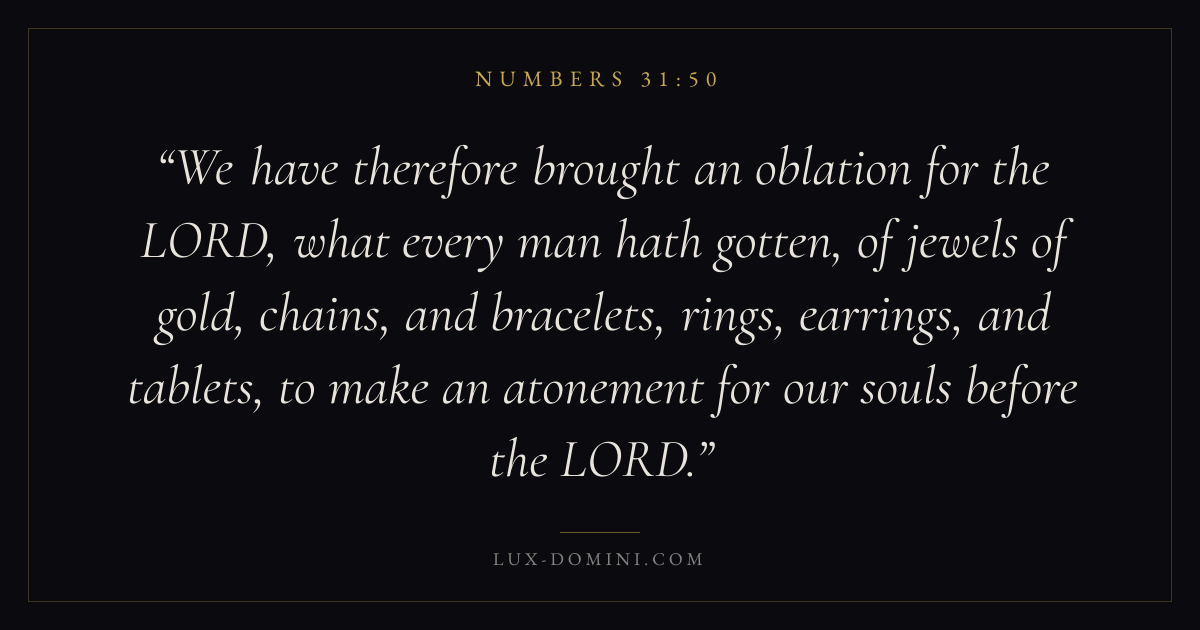 We have therefore brought an oblation for the LORD, what every man hath gotten, of jewels of gold, chains, and bracelets, rings, earrings, and tablets, to make an atonement for our souls before the LORD.