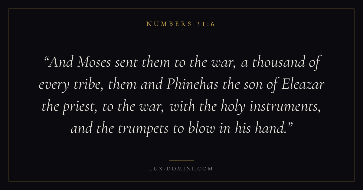 And Moses sent them to the war, a thousand of every tribe, them and Phinehas the son of Eleazar the priest, to the war, with the holy instruments, and the trumpets to blow in his hand.