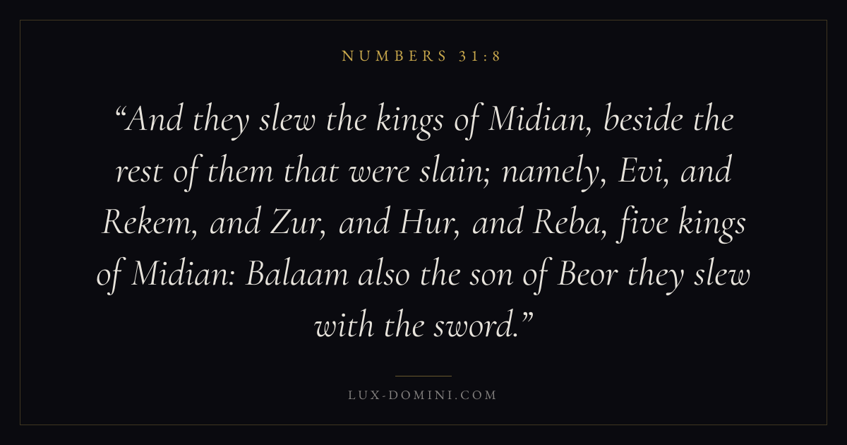 And they slew the kings of Midian, beside the rest of them that were slain; namely, Evi, and Rekem, and Zur, and Hur, and Reba, five kings of Midian: Balaam also the son of Beor they slew with the sword.