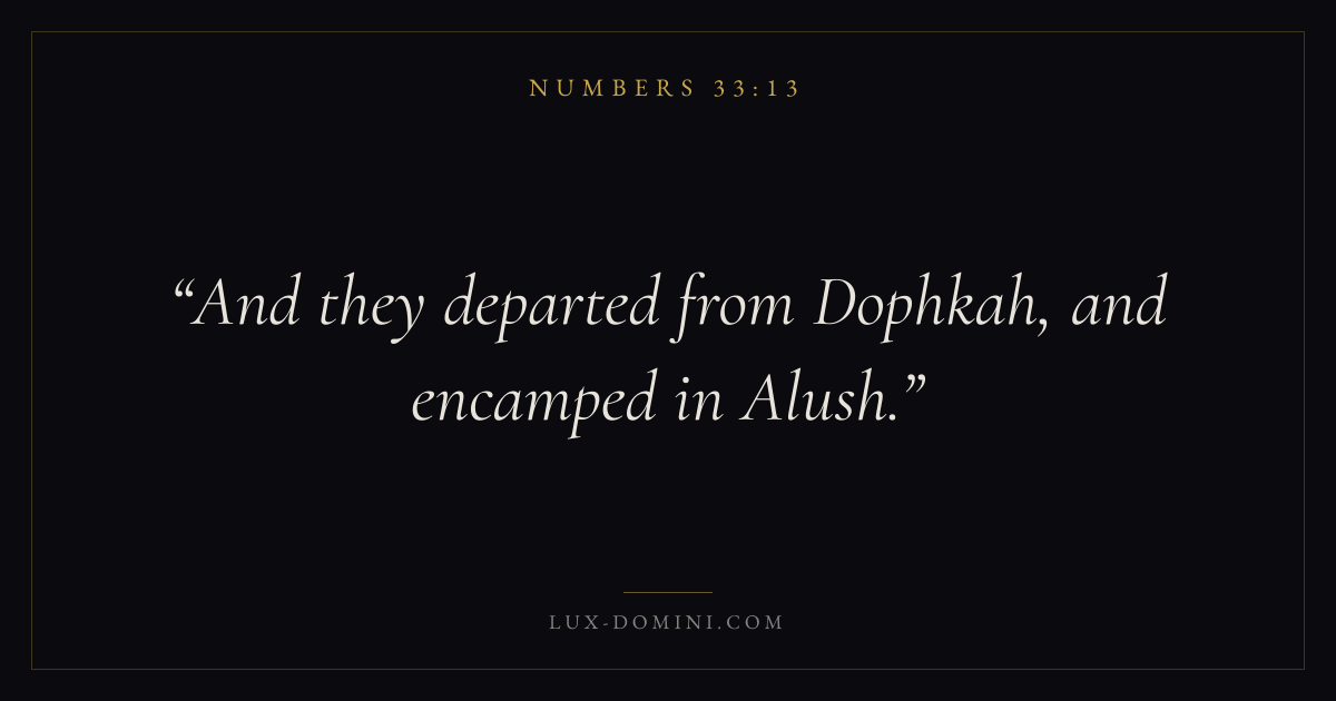 Books / Numbers / Chapter 33 / Verse 13 ← Numbers 33:12 Numbers 33:13 Numbers 33:14 → And they departed from Dophkah, and encamped in Alush. Download verse card Share on Twitter Share on Facebook Pin it ✦ Key themes Justice and mercyPilgrimageRebellionJudgment Read with Numbers 33:11Numbers 33:12Micah 6:8Amos 5:24 Related topics Bible verses about justice and mercy Glossary Dophkah Place Biblical settlement. Modern identification: Serabit el Khadim. Alush Place Biblical campsite. Modern identification: Wadi el Esh. ✦ Numbers Chapter 33 verses V. 1 V. 2 V. 3 V. 4 V. 5 V. 6 V. 7 V. 8 V. 9 V. 10 V. 11 V. 12 V. 13 V. 14 V. 15 V. 16 V. 17 V. 18 V. 19 V. 20 V. 21 V. 22 V. 23 V. 24 V. 25 V. 26 V. 27 V. 28 V. 29 V. 30 V. 31 V. 32 V. 33 V. 34 V. 35 V. 36 V. 37 V. 38 V. 39 V. 40 V. 41 V. 42 V. 43 V. 44 V. 45 V. 46 V. 47 V. 48 V. 49 V. 50 V. 51 V. 52 V. 53 V. 54 V. 55 V. 56