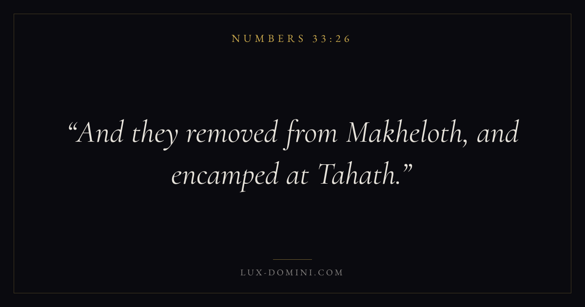 Books / Numbers / Chapter 33 / Verse 26 ← Numbers 33:25 Numbers 33:26 Numbers 33:27 → And they removed from Makheloth, and encamped at Tahath. Download verse card Share on Twitter Share on Facebook Pin it ✦ Key themes Justice and mercyPilgrimageRebellionJudgment Read with Numbers 33:27Numbers 33:28Micah 6:8Amos 5:24 Related topics Bible verses about justice and mercy Glossary Makheloth Place Biblical campsite. Modern identification: Kuntillet Ajrud. Tahath Place Biblical campsite. Modern identification: Wadi Umm Hashim. ✦ Numbers Chapter 33 verses V. 1 V. 2 V. 3 V. 4 V. 5 V. 6 V. 7 V. 8 V. 9 V. 10 V. 11 V. 12 V. 13 V. 14 V. 15 V. 16 V. 17 V. 18 V. 19 V. 20 V. 21 V. 22 V. 23 V. 24 V. 25 V. 26 V. 27 V. 28 V. 29 V. 30 V. 31 V. 32 V. 33 V. 34 V. 35 V. 36 V. 37 V. 38 V. 39 V. 40 V. 41 V. 42 V. 43 V. 44 V. 45 V. 46 V. 47 V. 48 V. 49 V. 50 V. 51 V. 52 V. 53 V. 54 V. 55 V. 56