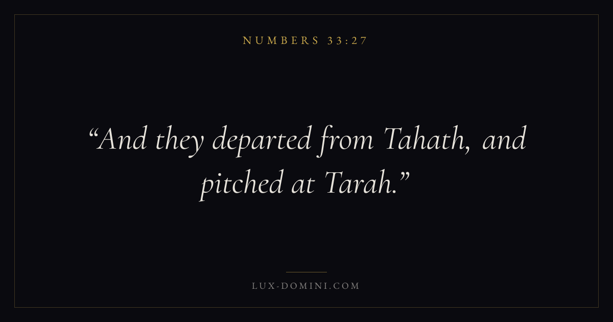 Books / Numbers / Chapter 33 / Verse 27 ← Numbers 33:26 Numbers 33:27 Numbers 33:28 → And they departed from Tahath, and pitched at Tarah. Download verse card Share on Twitter Share on Facebook Pin it ✦ Key themes Justice and mercyPilgrimageRebellionJudgment Read with Numbers 33:26Numbers 33:28Micah 6:8Amos 5:24 Related topics Bible verses about justice and mercy Glossary Tahath Place Biblical campsite. Modern identification: Wadi Umm Hashim. Terah Place Biblical campsite. Modern identification: Wadi Umm Hashim. ✦ Numbers Chapter 33 verses V. 1 V. 2 V. 3 V. 4 V. 5 V. 6 V. 7 V. 8 V. 9 V. 10 V. 11 V. 12 V. 13 V. 14 V. 15 V. 16 V. 17 V. 18 V. 19 V. 20 V. 21 V. 22 V. 23 V. 24 V. 25 V. 26 V. 27 V. 28 V. 29 V. 30 V. 31 V. 32 V. 33 V. 34 V. 35 V. 36 V. 37 V. 38 V. 39 V. 40 V. 41 V. 42 V. 43 V. 44 V. 45 V. 46 V. 47 V. 48 V. 49 V. 50 V. 51 V. 52 V. 53 V. 54 V. 55 V. 56