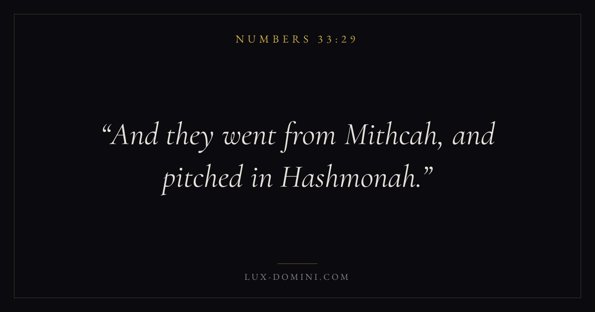 Books / Numbers / Chapter 33 / Verse 29 ← Numbers 33:28 Numbers 33:29 Numbers 33:30 → And they went from Mithcah, and pitched in Hashmonah. Download verse card Share on Twitter Share on Facebook Pin it ✦ Key themes Justice and mercyPilgrimageRebellionJudgment Read with Numbers 33:26Numbers 33:27Micah 6:8Amos 5:24 Related topics Bible verses about justice and mercy Glossary Mithkah Place Biblical campsite. Modern identification: Wadi Umm Hashim. Hashmonah Place Biblical campsite. Modern identification: Qoseimeh. ✦ Numbers Chapter 33 verses V. 1 V. 2 V. 3 V. 4 V. 5 V. 6 V. 7 V. 8 V. 9 V. 10 V. 11 V. 12 V. 13 V. 14 V. 15 V. 16 V. 17 V. 18 V. 19 V. 20 V. 21 V. 22 V. 23 V. 24 V. 25 V. 26 V. 27 V. 28 V. 29 V. 30 V. 31 V. 32 V. 33 V. 34 V. 35 V. 36 V. 37 V. 38 V. 39 V. 40 V. 41 V. 42 V. 43 V. 44 V. 45 V. 46 V. 47 V. 48 V. 49 V. 50 V. 51 V. 52 V. 53 V. 54 V. 55 V. 56