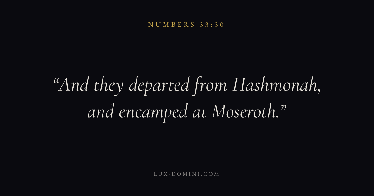 Books / Numbers / Chapter 33 / Verse 30 ← Numbers 33:29 Numbers 33:30 Numbers 33:31 → And they departed from Hashmonah, and encamped at Moseroth. Download verse card Share on Twitter Share on Facebook Pin it ✦ Key themes Justice and mercyPilgrimageRebellionJudgment Read with Numbers 33:26Numbers 33:27Micah 6:8Amos 5:24 Related topics Bible verses about justice and mercy Glossary Hashmonah Place Biblical campsite. Modern identification: Qoseimeh. Moseroth Place Biblical campsite. Modern identification: Har Zin. ✦ Numbers Chapter 33 verses V. 1 V. 2 V. 3 V. 4 V. 5 V. 6 V. 7 V. 8 V. 9 V. 10 V. 11 V. 12 V. 13 V. 14 V. 15 V. 16 V. 17 V. 18 V. 19 V. 20 V. 21 V. 22 V. 23 V. 24 V. 25 V. 26 V. 27 V. 28 V. 29 V. 30 V. 31 V. 32 V. 33 V. 34 V. 35 V. 36 V. 37 V. 38 V. 39 V. 40 V. 41 V. 42 V. 43 V. 44 V. 45 V. 46 V. 47 V. 48 V. 49 V. 50 V. 51 V. 52 V. 53 V. 54 V. 55 V. 56