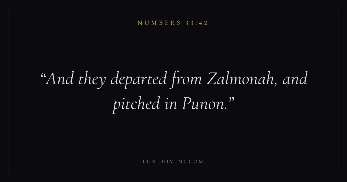 Books / Numbers / Chapter 33 / Verse 42 ← Numbers 33:41 Numbers 33:42 Numbers 33:43 → And they departed from Zalmonah, and pitched in Punon. Download verse card Share on Twitter Share on Facebook Pin it ✦ Key themes Justice and mercyPilgrimageRebellionJudgment Read with Numbers 33:41Numbers 33:43Micah 6:8Amos 5:24 Related topics Bible verses about justice and mercy Glossary Zalmonah Place Biblical campsite. Modern identification: Wadi es Salmaneh. Punon Place Biblical settlement. Modern identification: Khirbet Faynan. ✦ Numbers Chapter 33 verses V. 1 V. 2 V. 3 V. 4 V. 5 V. 6 V. 7 V. 8 V. 9 V. 10 V. 11 V. 12 V. 13 V. 14 V. 15 V. 16 V. 17 V. 18 V. 19 V. 20 V. 21 V. 22 V. 23 V. 24 V. 25 V. 26 V. 27 V. 28 V. 29 V. 30 V. 31 V. 32 V. 33 V. 34 V. 35 V. 36 V. 37 V. 38 V. 39 V. 40 V. 41 V. 42 V. 43 V. 44 V. 45 V. 46 V. 47 V. 48 V. 49 V. 50 V. 51 V. 52 V. 53 V. 54 V. 55 V. 56