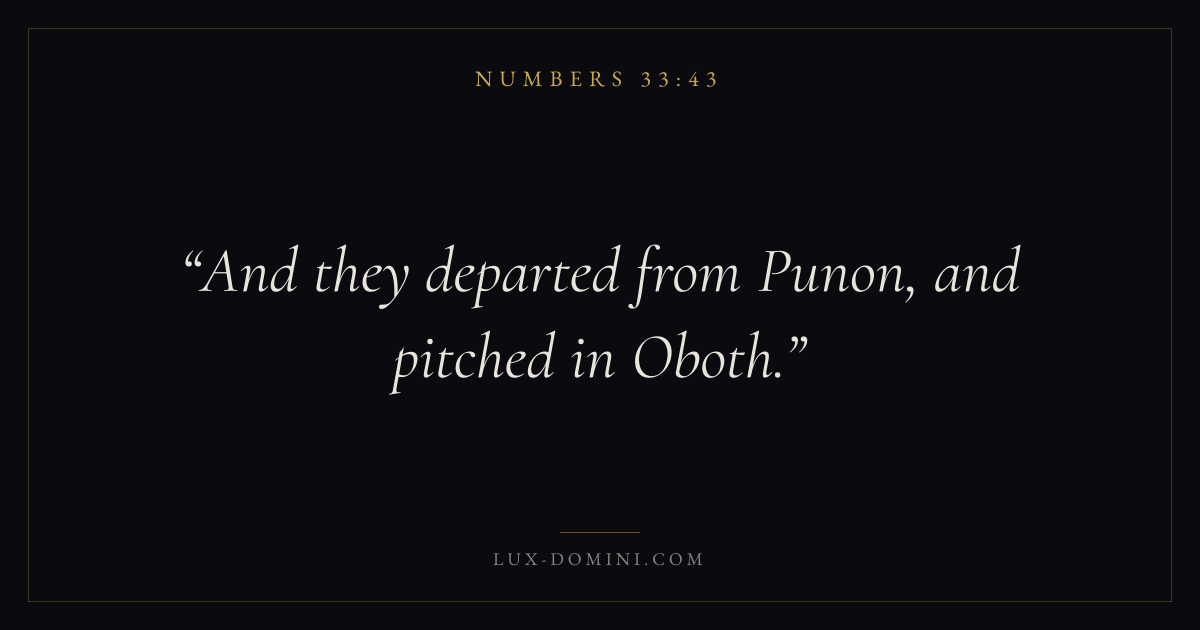 Books / Numbers / Chapter 33 / Verse 43 ← Numbers 33:42 Numbers 33:43 Numbers 33:44 → And they departed from Punon, and pitched in Oboth. Download verse card Share on Twitter Share on Facebook Pin it ✦ Key themes Justice and mercyPilgrimageRebellionJudgment Read with Numbers 33:41Numbers 33:42Micah 6:8Amos 5:24 Related topics Bible verses about justice and mercy Glossary Punon Place Biblical settlement. Modern identification: Khirbet Faynan. Oboth Place Biblical campsite. Modern identification: Ein Weibeh. ✦ Numbers Chapter 33 verses V. 1 V. 2 V. 3 V. 4 V. 5 V. 6 V. 7 V. 8 V. 9 V. 10 V. 11 V. 12 V. 13 V. 14 V. 15 V. 16 V. 17 V. 18 V. 19 V. 20 V. 21 V. 22 V. 23 V. 24 V. 25 V. 26 V. 27 V. 28 V. 29 V. 30 V. 31 V. 32 V. 33 V. 34 V. 35 V. 36 V. 37 V. 38 V. 39 V. 40 V. 41 V. 42 V. 43 V. 44 V. 45 V. 46 V. 47 V. 48 V. 49 V. 50 V. 51 V. 52 V. 53 V. 54 V. 55 V. 56