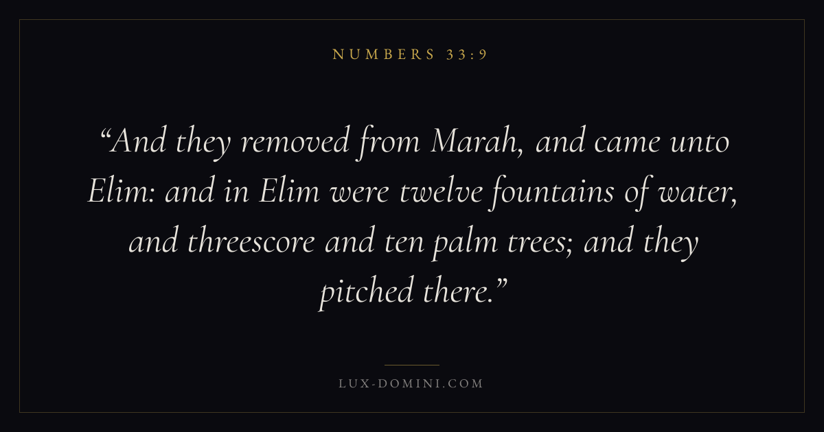 And they removed from Marah, and came unto Elim: and in Elim were twelve fountains of water, and threescore and ten palm trees; and they pitched there.